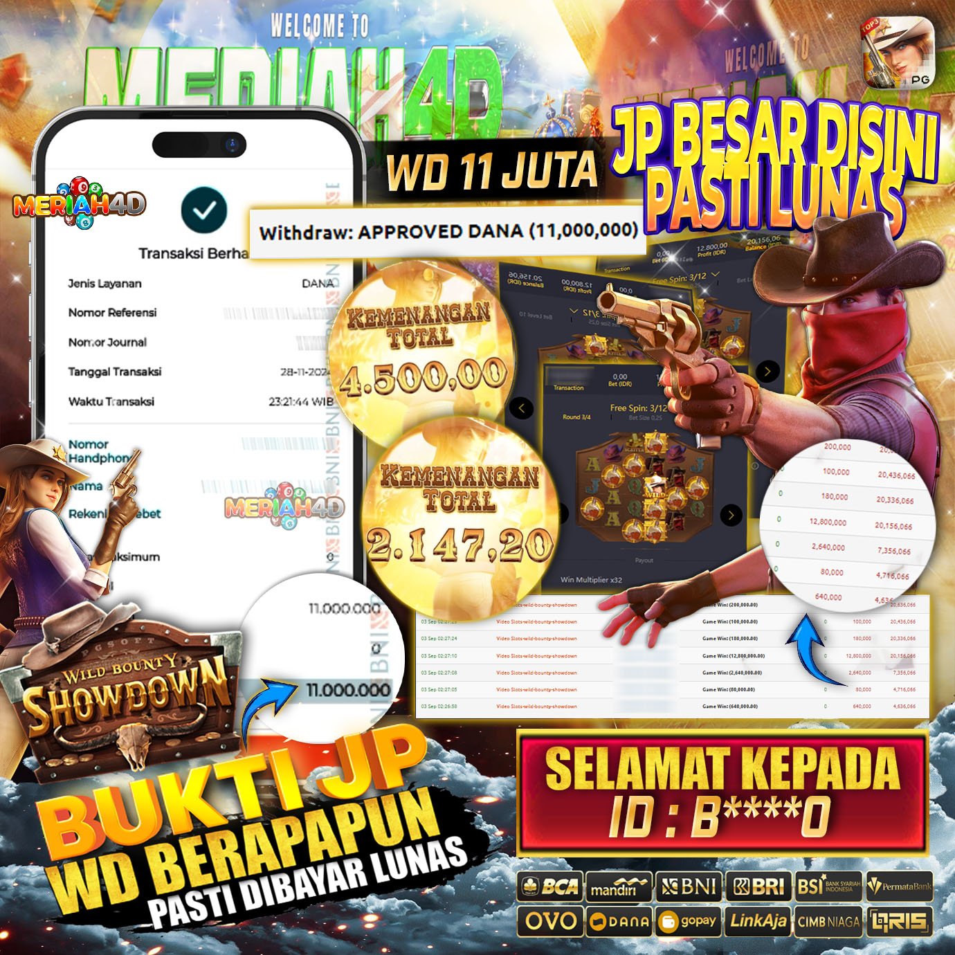 Selamat Kepada Id : B*****0 Atas Withdraw Rp. 11.000.000 Juta Hari ini. Ditunggu Withdraw Selanjutnya dan ajak juga teman temannya bergabung di Meriah4d