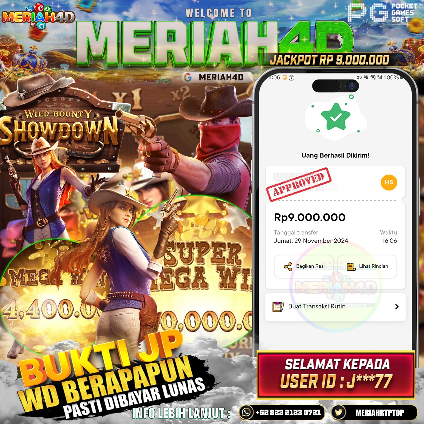 Selamat Kepada Id : J*****77 Atas Withdraw Rp. 9.000.000 Juta Hari ini. Ditunggu Withdraw Selanjutnya dan ajak juga teman temannya bergabung di Meriah4d