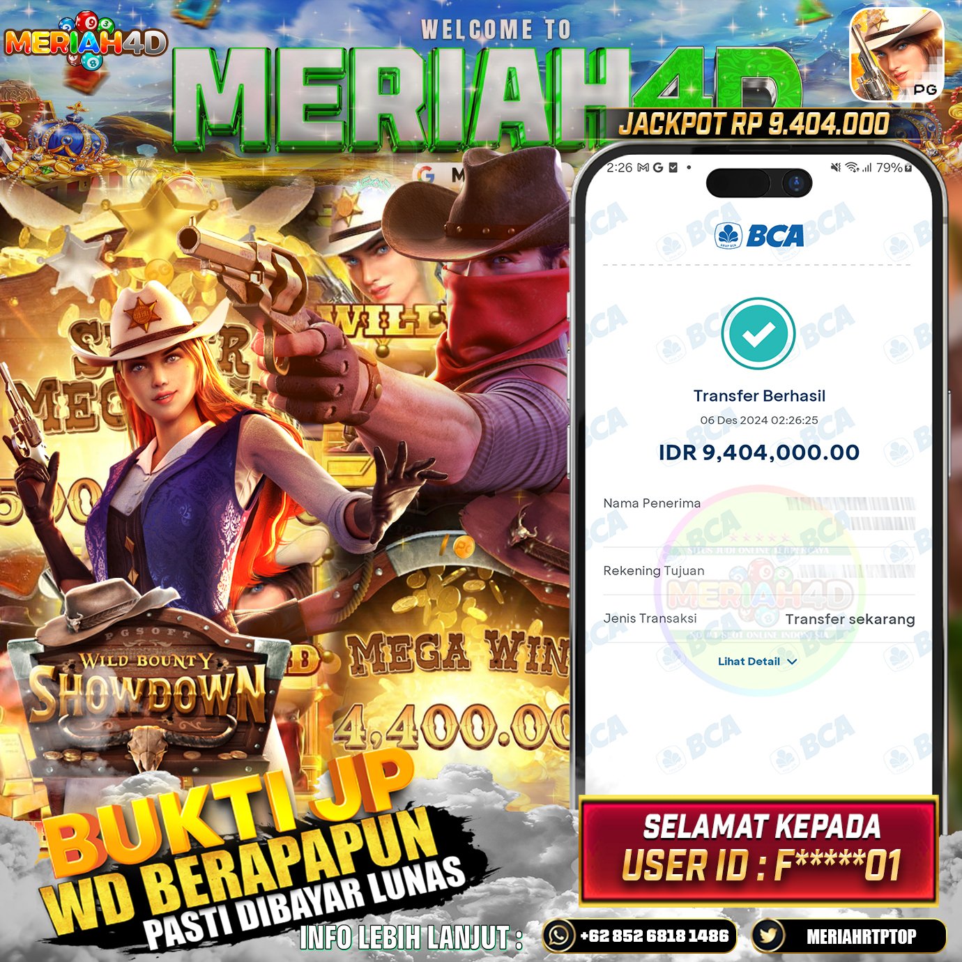 Selamat Kepada Id : F*******01 Atas Withdraw Rp. 9.404.000 Juta Hari ini. Ditunggu Withdraw Selanjutnya dan ajak juga teman temannya bergabung di Meriah4d