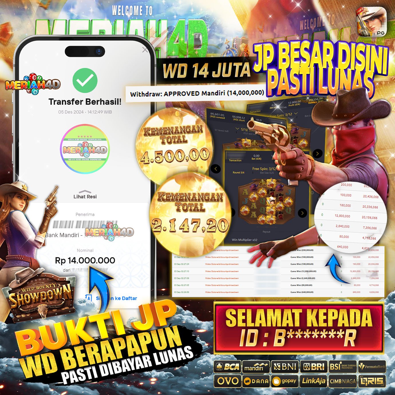 Selamat Kepada Id : B*******R Atas Withdraw Rp. 14.000.000 Juta Hari ini. Ditunggu Withdraw Selanjutnya dan ajak juga teman temannya bergabung di Meriah4d