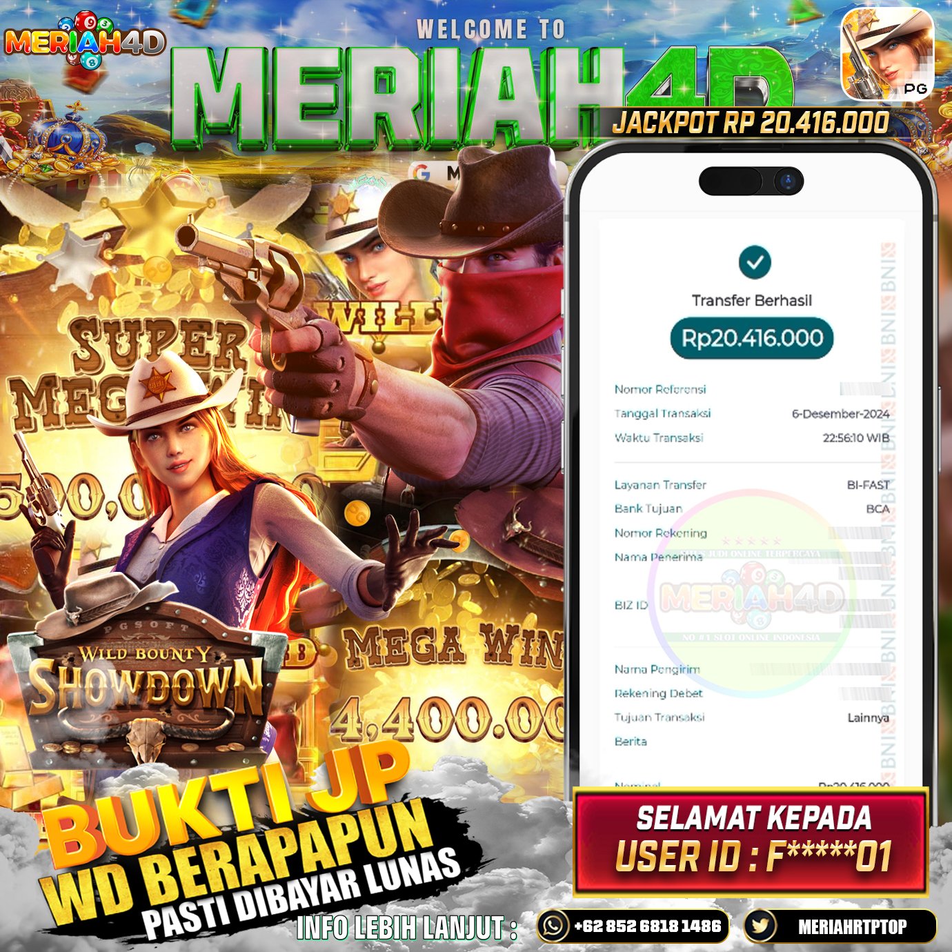 Selamat Kepada Id : F*******01 Atas Withdraw Rp. 20.416.000 Juta Hari ini. Ditunggu Withdraw Selanjutnya dan ajak juga teman temannya bergabung di Meriah4d