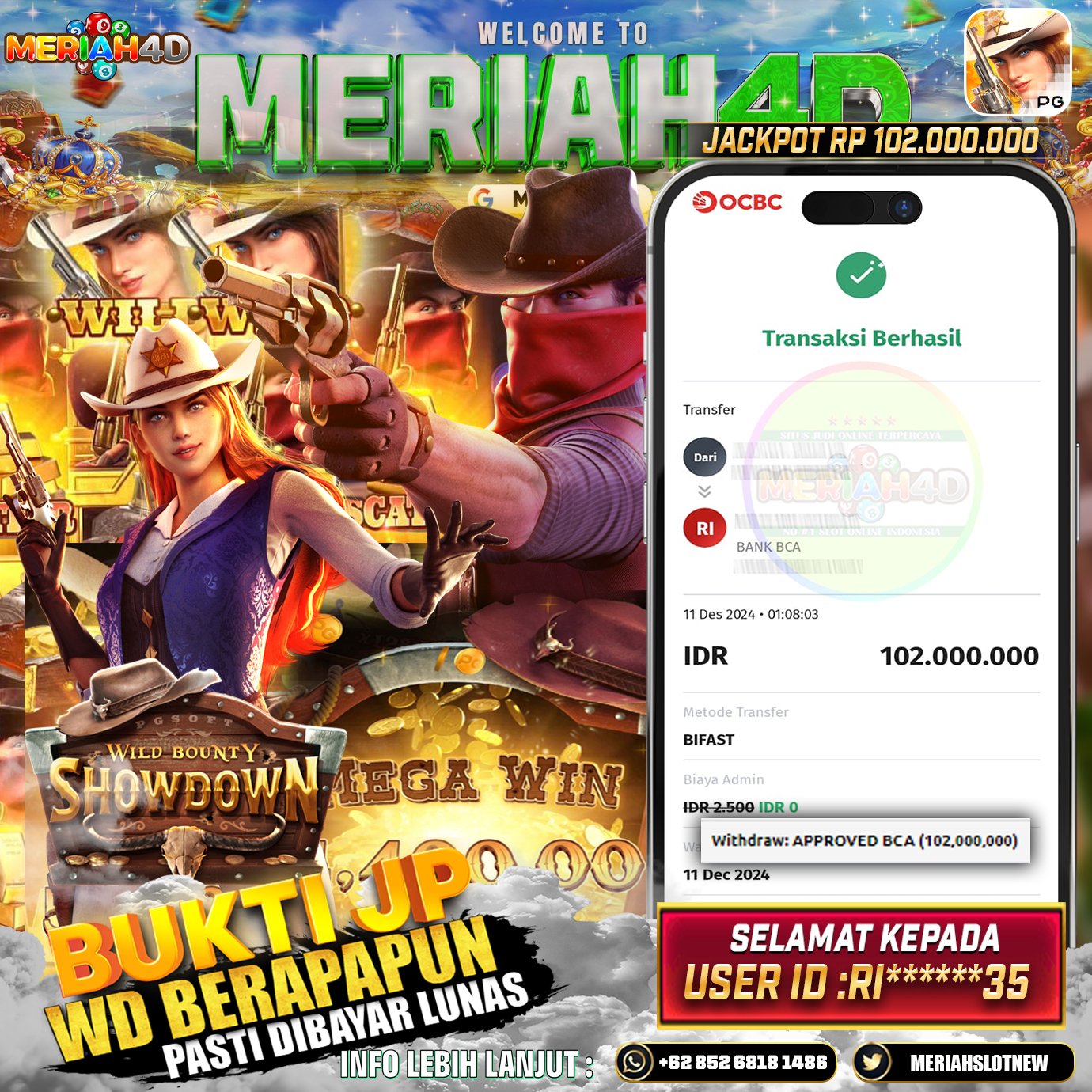 Selamat Kepada ID : RI*******35 Atas Withdraw Rp. 102.000.000 Juta Hari ini. Ditunggu Withdraw Selanjutnya dan ajak juga teman temannya bergabung di Meriah4d