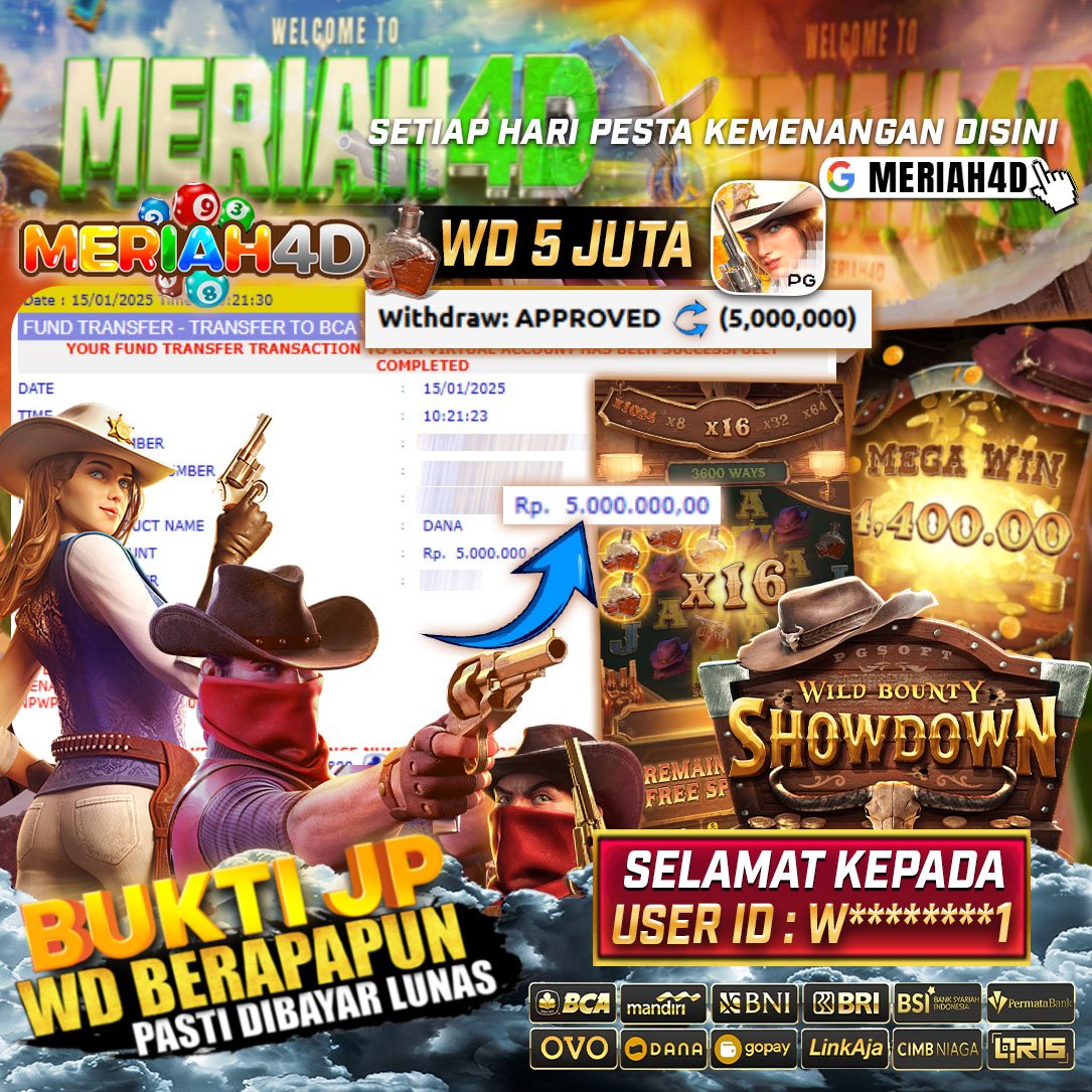 Selamat Kepada ID : W******1 Atas Withdraw Rp. 5.000.000 Juta Hari ini. Ditunggu Withdraw Selanjutnya dan ajak juga teman temannya bergabung di Meriah4d