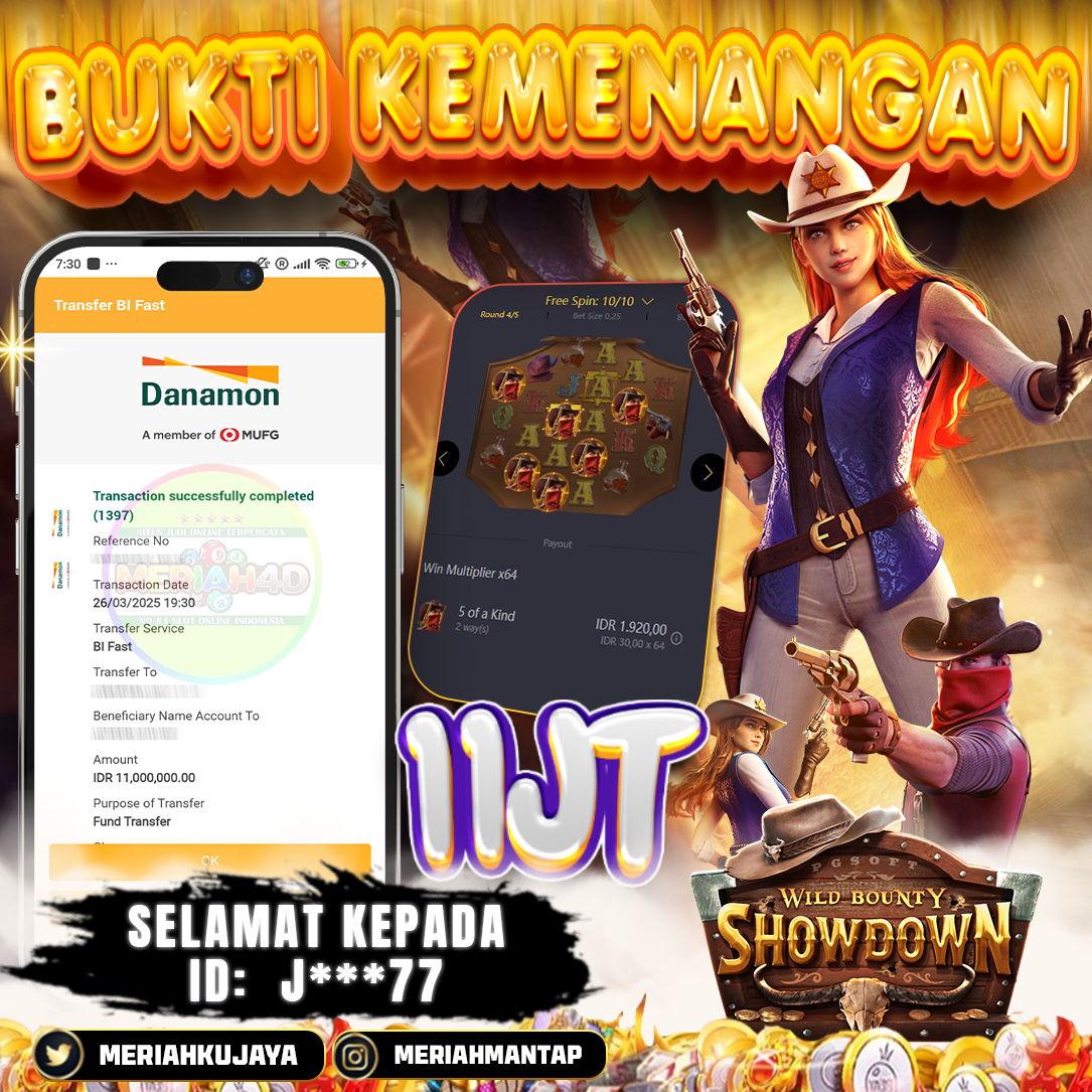 Selamat Kepada ID : J******77 Atas Withdraw Rp. 11,000,000 Juta Hari ini. Ditunggu Withdraw Selanjutnya dan ajak juga teman temannya bergabung di Meriah4d