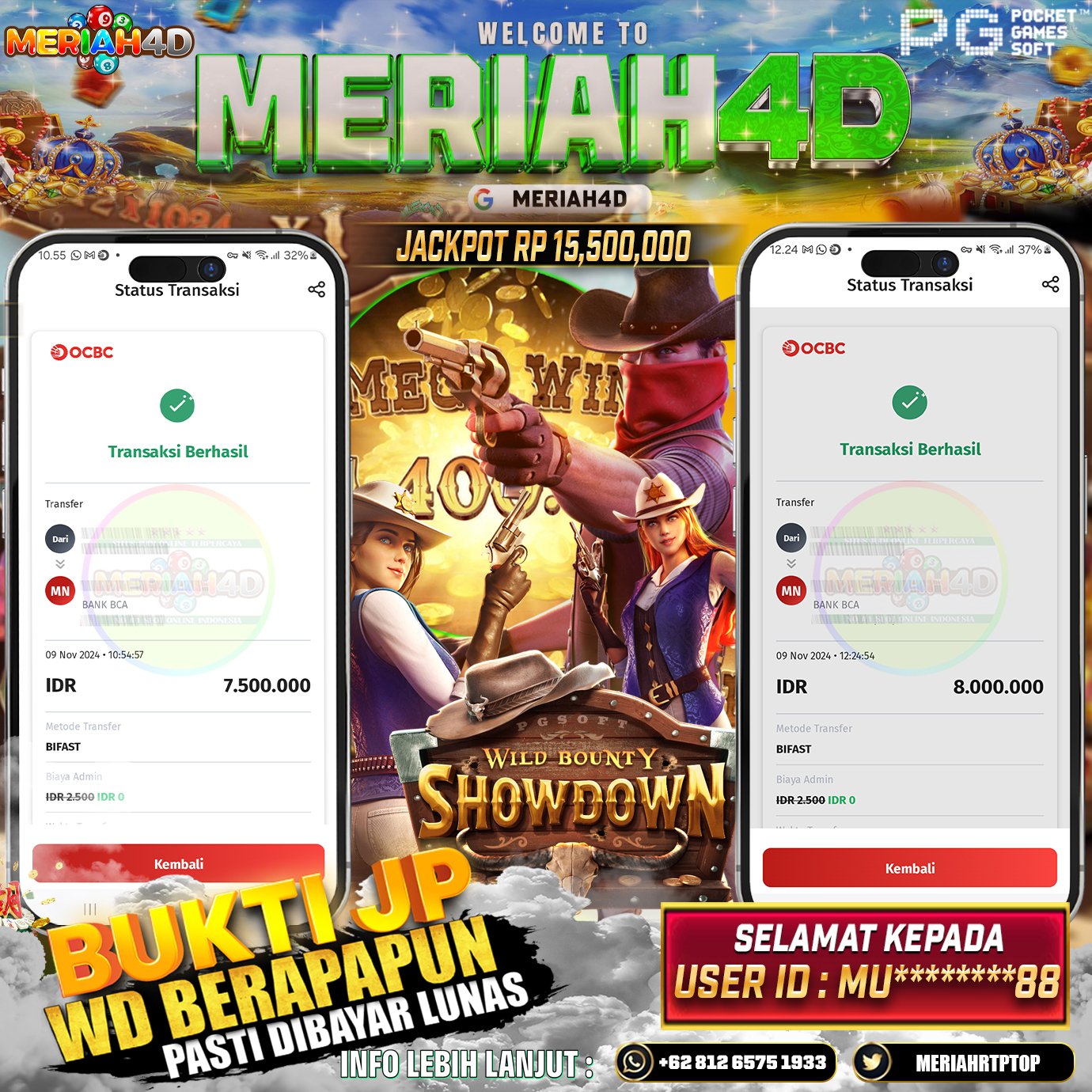 Selamat Kepada Id : MU******88 Atas Withdraw Rp. 15.500.000 Juta Hari ini. Ditunggu Withdraw Selanjutnya dan ajak juga teman temannya bergabung di Meriah4d